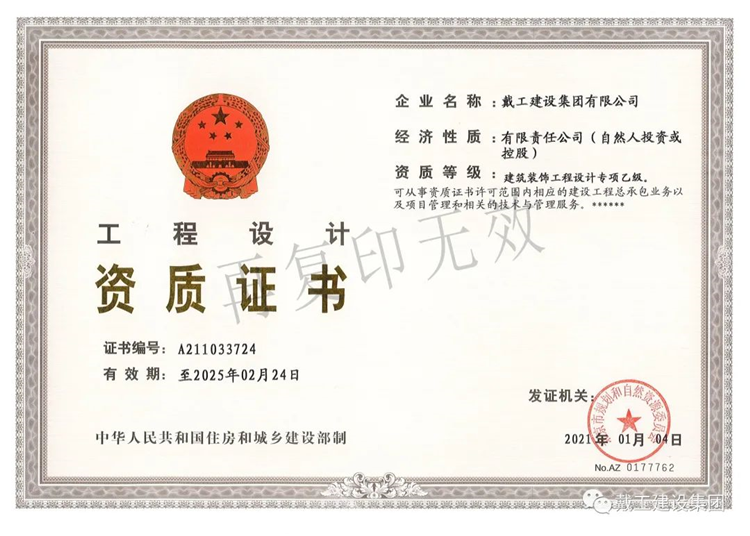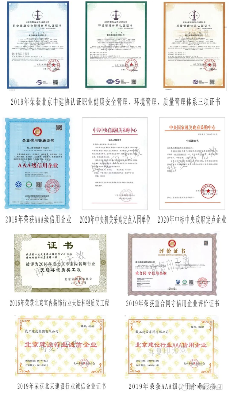 戴工建設(shè)集團(tuán)有限公司系一家集裝飾設(shè)計(jì)、工程施工、材料配送、木門、地板、家具、 裝飾品開發(fā)為一體的裝飾企業(yè)。公司位于北京市大興區(qū)。具有建委頒發(fā)的建筑裝飾裝修專業(yè) 壹級、防水保溫工程專業(yè)壹級、建筑幕墻專業(yè)貳級、消防設(shè)施專業(yè)貳級、電子與智能化專業(yè) 貳級,特種工程(結(jié)構(gòu)補(bǔ)強(qiáng))專業(yè)不分等級、建筑機(jī)電安裝專業(yè)叁級、環(huán)保工程專業(yè)叁級、 鋼結(jié)構(gòu)專業(yè)叁級、建筑工程總承包叁級、建筑裝飾工程設(shè)計(jì)專項(xiàng)乙級、中國展覽館協(xié)會展覽 陳列工程設(shè)計(jì)與施工一體化壹級資質(zhì)和中國展覽館協(xié)會展覽工程企業(yè)資質(zhì)。公司通過了GB/T19001,IS014001,GB/T/OHSAS 認(rèn)證。主要從事辦公空間、餐飲酒店、商業(yè)空間、學(xué)校、 醫(yī)院、別墅、住宅等場所的裝修設(shè)計(jì)和施工。公司經(jīng)北京市工商管理局正式批準(zhǔn)注冊、北京市建委審核認(rèn)定,已取得國家正規(guī)資質(zhì), 為中國建筑裝飾協(xié)會、中國室內(nèi)裝飾協(xié)會、北京室內(nèi)裝飾協(xié)會、北京市建筑裝飾協(xié)會的會員 單位,誠信五星級單位、質(zhì)量 AAA 級單位。多年來公司持續(xù)穩(wěn)步發(fā)展,下設(shè)財(cái)務(wù)部、綜合管理部、工程質(zhì)量部、市場開發(fā)部、經(jīng)營 部、設(shè)計(jì)部和合同預(yù)算部七個(gè)部門。建立了從方案設(shè)計(jì)、工程施工、質(zhì)量監(jiān)督到售后服務(wù)等 一整套細(xì)致合理的服務(wù)流程體系。由經(jīng)驗(yàn)豐富、時(shí)尚創(chuàng)新的設(shè)計(jì)精英;正規(guī)培訓(xùn)、技藝嫻熟 的南方技工;資深專業(yè)的管理人員共同組建成一支誠信、敬業(yè)、務(wù)實(shí)、創(chuàng)新的精英團(tuán)隊(duì)。先 進(jìn)的辦公及施工、檢測設(shè)備;人文、科學(xué)的企業(yè)管理模式,為工程質(zhì)量和公司發(fā)展提供了有 力的保障。公司以先進(jìn)的設(shè)計(jì)理念、精深的設(shè)計(jì)功底為先導(dǎo),以規(guī)范的管理、精湛的施工技術(shù)為基 礎(chǔ),以完善的服務(wù)體系為依托,以產(chǎn)業(yè)化模式經(jīng)營降低成本為優(yōu)勢,為客戶提供專業(yè)化、人 性化、個(gè)性化的裝修產(chǎn)品和服務(wù),并不懈努力以提升和超越客戶的消費(fèi)價(jià)值。面對激烈的市場競爭,公司全體員工一直秉承“以質(zhì)量求生存,以服務(wù)求發(fā)展”的經(jīng)營 理念,“客戶的滿意是我們工作的唯一標(biāo)準(zhǔn)”,始終堅(jiān)持以客戶的需求和滿意為核心,從而使 公司不斷發(fā)展壯大,并贏得了較大的市場份額,成為裝飾行業(yè)中的佼佼者。公司將一如既往的致力于為社會各界提供更完善、更完美的裝修服務(wù),精心鑄造“戴工” 品牌!并愿與業(yè)界同仁攜手,共建行業(yè)自律,維護(hù)市場環(huán)境,樹立行業(yè)新風(fēng),推動行業(yè)發(fā)展, 引領(lǐng)裝修新潮流,構(gòu)建和諧社會之和諧裝修新篇章!