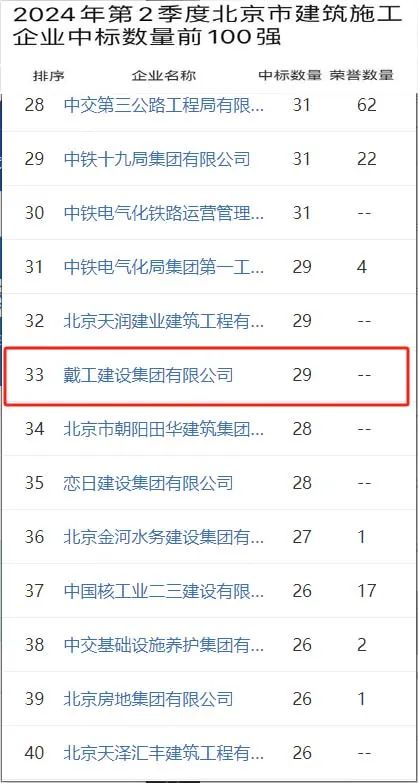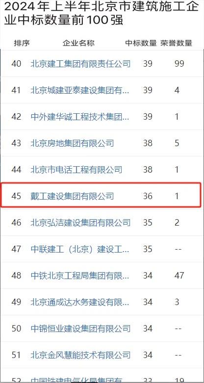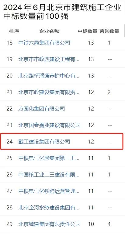 時間推進到2024年6月,戴工集團更是迎來了單月的高光時刻。在這個關鍵月份,戴工集團憑借出色的項目策劃和執(zhí)行能力,一舉將排名提升至北京市建筑施工企業(yè)中標數(shù)量前100強的第24位。這一成績的取得,充分展示了戴工集團在短期內(nèi)的快速響應能力和高效執(zhí)行力,也為其在市場上的進一步拓展奠定了堅實基礎。